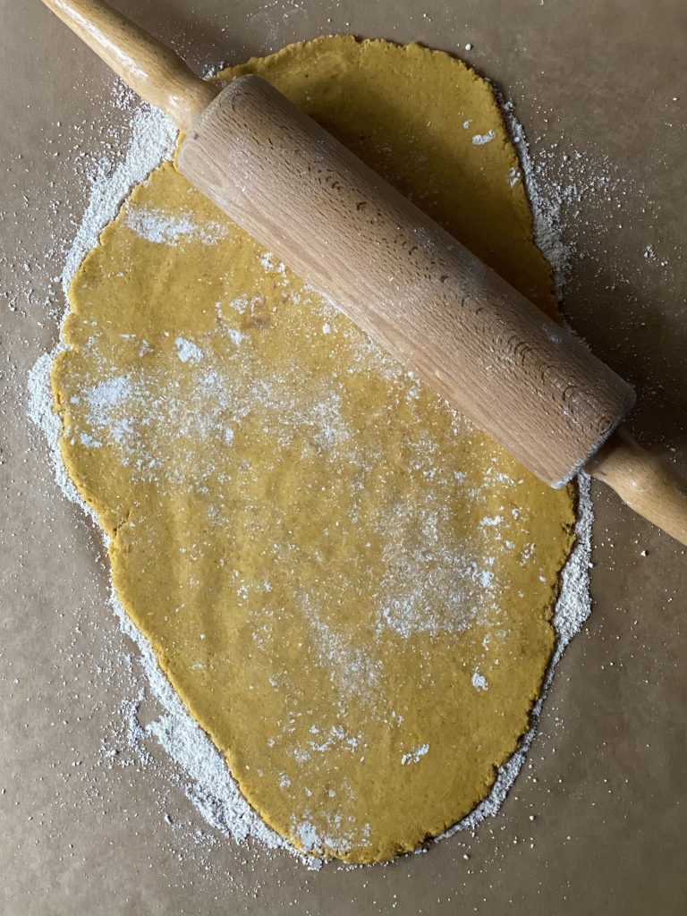 Gradually add the oat flour to the pumpkin and peanut butter mixture, stirring until you have a firm dough. If the dough is too sticky, you can add a bit more oat flour.